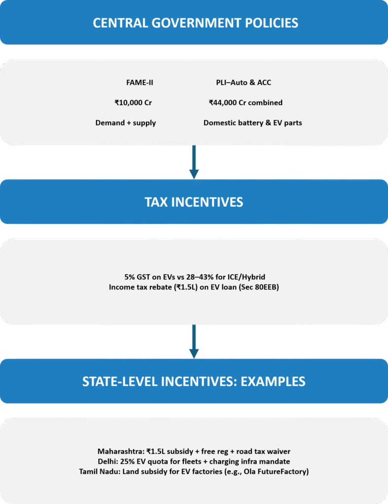 - Over 20 states now have dedicated EV policies offering road tax waivers, free registration, and charging infra support.