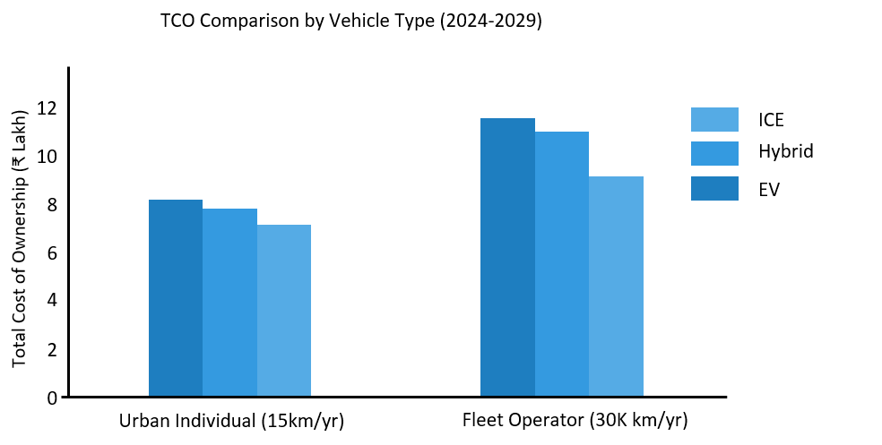 - EVs are already TCO-favorable with government incentives and low running costs, saving ₹1L–₹1.5L over ICEs.
